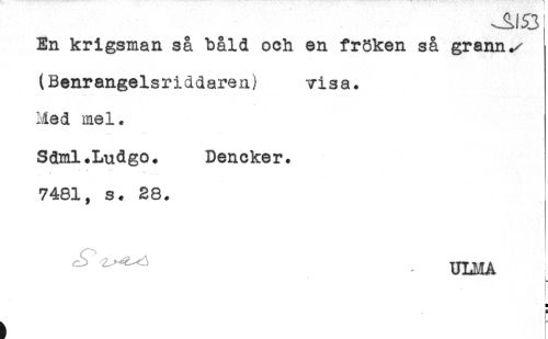 //// En krigsman så båld och en fröken så granna //// (Benrangelsriddaren) visa. //// Med mel. //// Sdml^Ludgo. Dencker. //// ** . //// 7481, s. 28. //// ^^ ^^ ULMA ////
