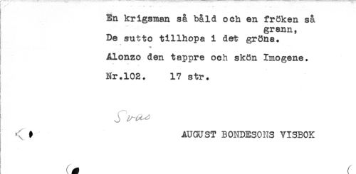//// En krigsman så båld och en fröken så //// grann, //// De sutto tillhopa i det gröna. //// A - - ^ - //// f * //// Alonzo den tappre och skön Imogene. //// t " //// Nr.102. 17 str. //// } //// ! //// ! //// t AUGUST BONDESONS VISBOK //// ' ////