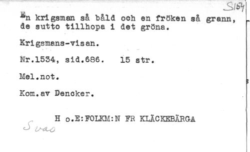 //// ^n krigsman så båld och en fröken så grann, //// de sutto tillhopa i det gröna. //// v //// Kri gsmans-vi s an. //// * **' , . ^ //// Nr.1534, sid.686. 15 str. //// Mel.not. //// Kom.av Denoker. //// H o.E:FOLKM:N FR KLACKEBÄR&Å ////