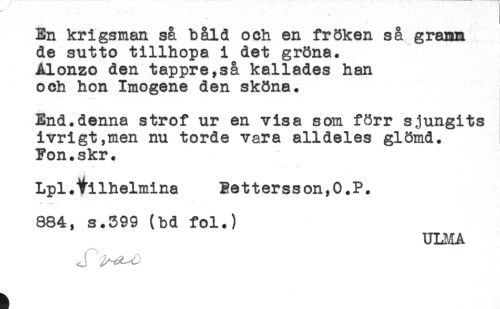 //// En krigsman så båld och en fröken så gramm //// de sutto tillhopa i det gröna. //// Alonzo den tappre,så kallades han //// och hon Imogene den sköna. //// End.denna strof ur en visa som förr sjungits //// ivrigt,men nu torde vara alldeles glömd. //// Fon.skr. //// Lpl.tilhelmina Betterss on,0.P. //// 884, s.399 (bd fol.) //// h ////