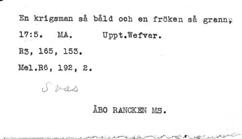 //// En krigsman så båld och en fröken så granny //// 17:5. MÅ. Uppt.Wefvar. //// -v ^ * t , //// R3, 165, 153. //// Mel.R6, 192, 2. //// ÅBO RANCKEN MS. ////
