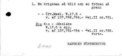 //// En krigsman sa bald och en fröken sa //// grann //// i* ^ ^ //// A - - Öfv.Maal. W.17.5 - //// v. af 137,762,764.- Del.II nr.761. //// - t ; - //// D:o d:o - -Maalaks //// W.17.5 n app. //// v. af 137,761-764 - ^el.II nr.762. //// ! - forts. //// * ////