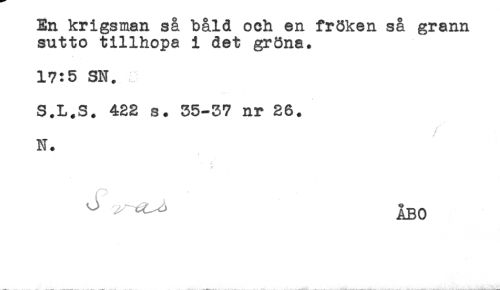 //// En krigsman så båld och en fröken så grann //// sutto tillhopa i det gröna. //// 17:5 SN. //// S.L.S. 422 s. 35-37 nr 26. //// N. //// 'O ^ ÅBO ////