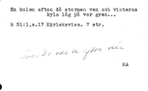 //// En kulen afton då stormen ven och vinterns //// kyla låg på var gren... //// * //// B 51:1,S.17 Kärleksvisa. 7 str. //// - ^ ^ ^ ^ //// RA //// t ////
