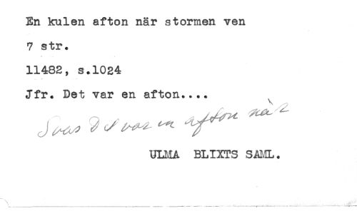 //// En kulen afton när stormen ven //// 7 str. //// * .. < //// 11482, s.1024 //// Jfr. Det var en afton.... //// UM.IA BLIXTS SAI-IL. ////