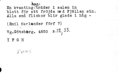 //// En kvantingfträder i salen in //// blott för att fröjda rad Fjällan sin. //// Alla små flickor blir glada i håg - //// (Emil Ndrländer förf ?) //// * ^ 1. . , ** T t //// Vg.Götebbrg. 4650 //// I F G H ////