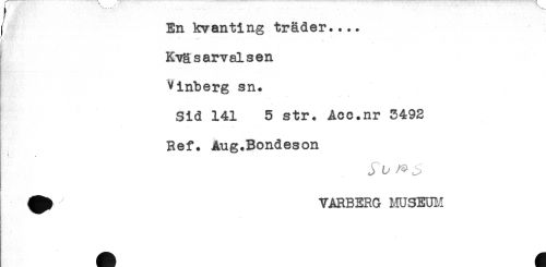 //// ( En kvanting träder.... //// j ' //// KiTgsarvalsen //// Vinberg sn. //// Sid 141 5 str. Åcc.nr 3492 //// Ref. Aug.Bondeson //// ^ YARBERG IvIUSEUM //// ' ////