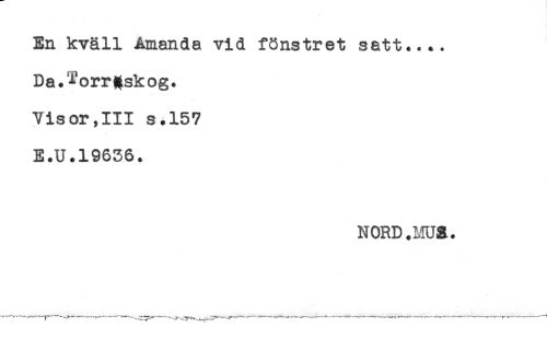 //// En kväll Amanda vid fönstret satt.... //// Da.Torr$skog. //// Visor,III s.157 //// E.U.19636. //// NORD.MUS. ////