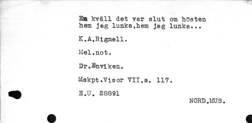 //// En kväll det var slut om hösten //// hem jag lunka,hem jag lunka... //// & *--- //// !. - - //// K.A.Rignell. //// Mel.not. //// T * //// i W' //// Dr.Enviken. //// - ... //// Mskpt.Visor VII.s. 117. //// E.U. 28891 //// ^^ NORD .ms. ////