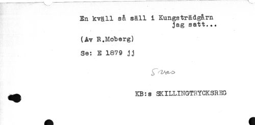 //// En kväll så säll i Kungsträdgårn //// jag satt... //// (Åv R.Moberg) //// Se: E 1879 jj //// ^^ KB:s SKILLINGTRYCKSREG ////