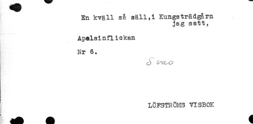 //// En kväll så säll,i Kungsträdgårn //// jag satt, //// Apalsinflickan //// Nr 6. //// T //// !. //// ! LÖFSTRÖMS VISBOK ////