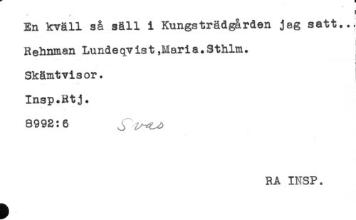 //// En kväll så säll i Kungsträdgården jag satt..< //// Rehnman Lundeqvist,Maria.Sthlm. //// ! //// Skämtvisor. //// Insp.Rtj. //// 8992:6 J //// RA INSP. ////
