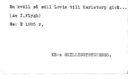 //// En kväll så säll Lovis till Karlstorp gick... //// (Av I.Flygh) //// i //// ! //// Se: E 1885 r, //// < //// ! //// - //// ) //// KB:s SKILLINGTRYCKSREG. //// __ _ __ __ ^ __ ___ j ////