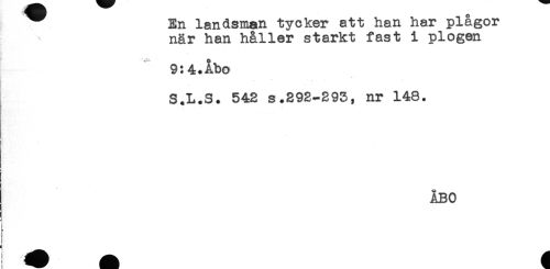 //// En landsman tycker att han har plågor //// när han håller starkt fast i plogen //// 9:4.Åbo //// * f //// S.L.S. 542 s.292-293, nr 148. //// j //// ÅBO ////