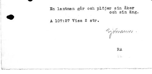 //// En lantman går och plöjer sin åker //// och sin äng. //// ^^ Å 107:27 Visa 2 str. //// J_____..t .. . . //// F //// i RÅ ////