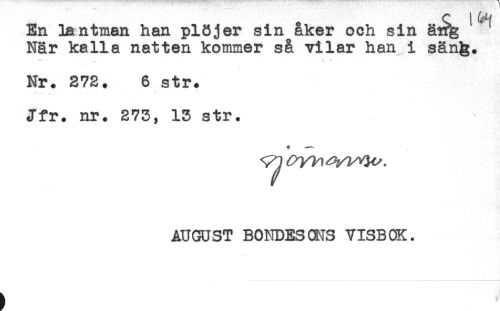 //// En Tantman han plöjer sin åker och sin ä^ ^ //// När kalla natten kommer s& vilar han i sän&. //// Nr. 272. 6 str. //// Jfr. nr. 273, 13 str. //// AUGUST BONDES CNS VISBOK. ////