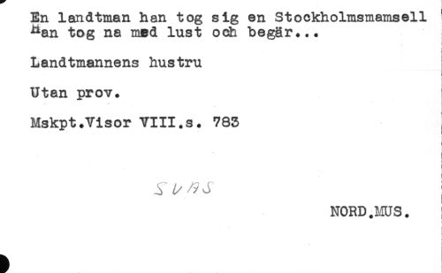 //// En landtman nan tog sig en snocKnoimsmamseii f //// ^-an tog na med lust och begär... //// i //// { //// r //// Landtmannens hustru //// Utan prov. //// Mskpt.Visor VIII.s. 783 //// ! //// ! //// ! //// NORD.MUS. //// i //// t //// i //// I //// i ////