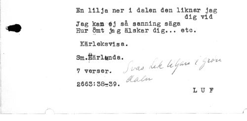 //// En lilja ner i dalen den liknar jag //// I dig vid //// ^^ Jag kan 6j så sanning säga //// Hur 5mt jag älskar dig... etc. //// + ? //// i //// Kärleksvisa. //// . //// 7 verser. //// /2663:38^39. //// L U F //// ^ - __ ////