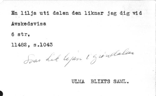 //// En lilja uti dalen den liknar jag dig vid //// * .. //// Avskeds vis a //// i //// i //// 6 str, //// < * //// 11482, s.1043 //// t //// i //// ULI/IA BLIXTS S^IL. //// ' //// i //// f //// ! //// ^ ! ////