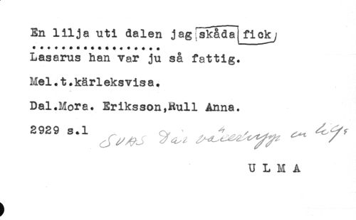 //// En lilja uti dalen j ag "skåda) fickj //// Lasarus han var ju så fattig. //// Mel.t.kärleksvis a. //// Dal.Mora. Eriksson,Rull Anna. //// 2929 s.l ^ -<- ^ ^ ^^ //// U L M A ////