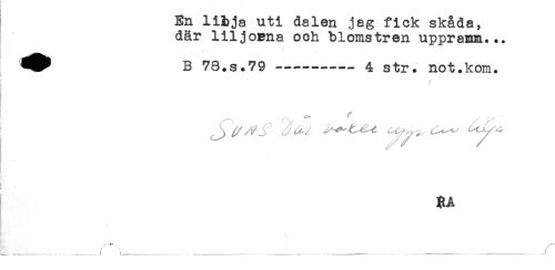 //// En libja uti dalen jag fick skåda, //// där liljoBna och blomstren upprann... //// ^^ B 78.S.79--- 4 str. not.kom. //// ! //// RA ////