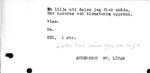 //// Nn lilja uti dalen jag fick skåda, //// Där rosorna och blomstern^ upprann, //// "Visa. //// Da. //// ^ 231, 1 str. //// i ANDERSSON SY. LÅTAR //// I ////
