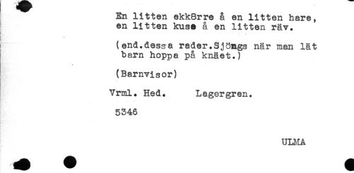 //// En litten ekk8rre å en litten hare, //// en litten kuse å en litten räv. //// K ' - . ^ //// < //// (end.dessa rader.Sjöngs när man lät //// barn hoppa på knäet.) //// (Barnvisor) //// Vrml. Hed. Lagergren. //// T . ' * //// 5346 //// j //// ULMA //// Hå** å ////