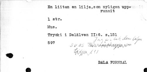 //// En liiten en lilja,som nyligen upp-ur ' //// runnit //// 1 str. //// Mus. //// Trycki i Dalälven 11:6. s.151 //// DALA FORNSAL //// * ' ////