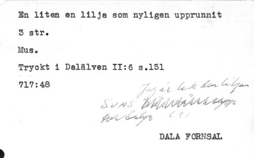 //// En liten en lilja som nyligen upprunnit //// 3 str. //// Mus., //// Tryckt i Dalälven 11:6 s*151 //// 717:48 //// DALA FORNSAL ////