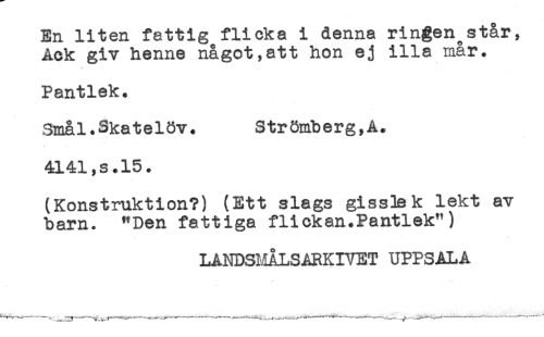 //// En liten fattig flicka i denna ringen^står, //// Ack giv henne något,att hon ej illa mår. //// Pantlek. //// Smål.Skatelöv. Strömberg,A. //// 4141,s.15. //// (Konstruktion?) (Ett slags gisslek lekt av //// barn. "Den fattiga flickan.Pantlek") //// LANDSMÅLSARKIVET UPPSALA ////