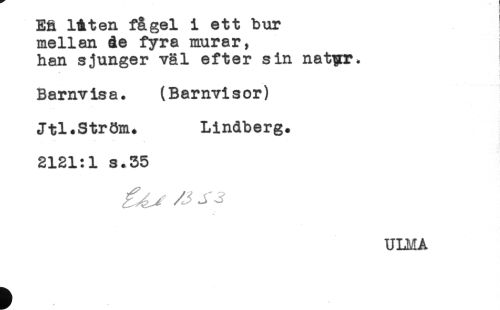 //// ER liten fågel i ett bur //// mellan de fyra murar, //// han sjunger väl efter sin natyr* //// Barnv is a. (Barnvi s or) //// Jtl.Ström. Lindberg. //// 2121:1 s.35 //// ULMA ////