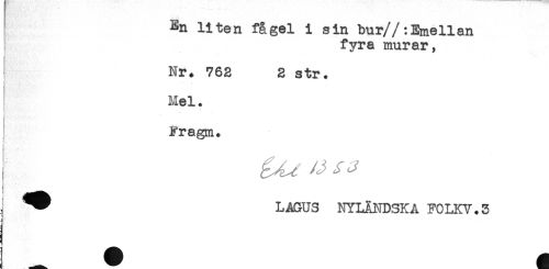 //// En liten fågel i sin bur//:Emellan //// fyra murar, //// Nr. 762 2 str. //// Mel. //// Fragm. //// ] ^^ LAGUS NYLANDSKA F0LKV.3 ////