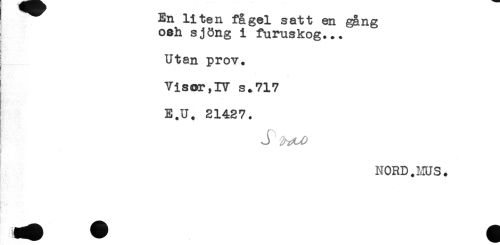 //// En liten fågel satt en gång //// oeh sjöng i furuskog... //// Utan prov. //// Visor,IV s.717 //// E.U. 21427. //// NORD.MUS. //// Lf- //// r * * ////