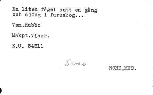 //// En liten fågel satt en gång //// och sjöng i furuskog... //// Vsm.Rubbo //// Mskpt.Visor. //// E.U. 34311 //// <J t^z^o I //// NORD.MUS. //// t //// i //// J //// ) ////