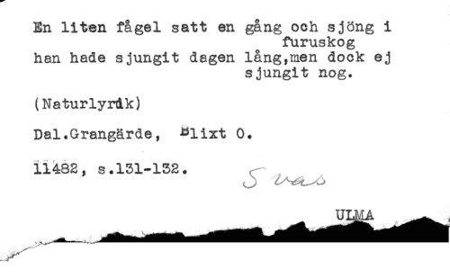 //// En liten fågel satt en gång och sjöng i //// furuskog //// han hade sjungit dagen lång,men dock ej //// sjungit nog. //// (Naturlyrik) //// Dal.Grangärde, Rlixt 0. //// 11482, s.131-132. ////