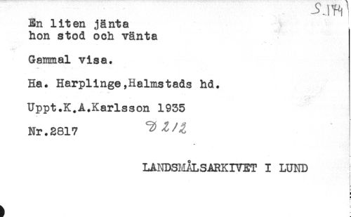 //// En liten jänta //// hon stod och vänta //// Gammal visa. //// -if* - ^ - -- \. < - ^ //// Ha. Harplinge,Halmstads hd. //// Uppt.K^Å.Karlsson 1935 //// Nr. 2817 //// IJLNDSMALSARKIVET I LUND i //// ' //// ! //// t ////