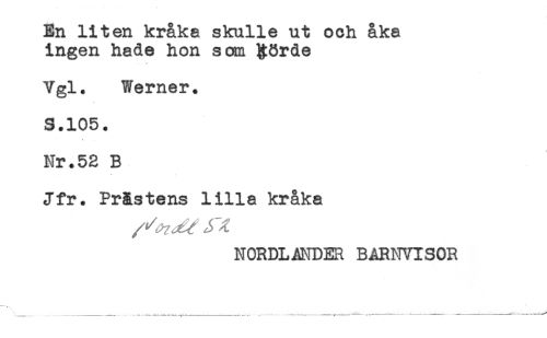 //// En liten kråka skulle ut och åka //// ingen hade hon son %8rde //// Ygl. Werner. //// S.105. //// Nr.52 B //// Jfr. Prästens lilla kråka //// NORDLANDER BARNVISOR ////