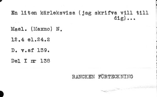 //// En liten kärleksvisa (jag skrifva vill till //// dig)... //// Maal. (Maxmo) N. //// 12.4 el.24.2 //// L //// D. v.af 139. ! //// i //// Del I nr 138 ; //// RANCKEN FÖRTECKNING //// ^ . * -" * * * ////