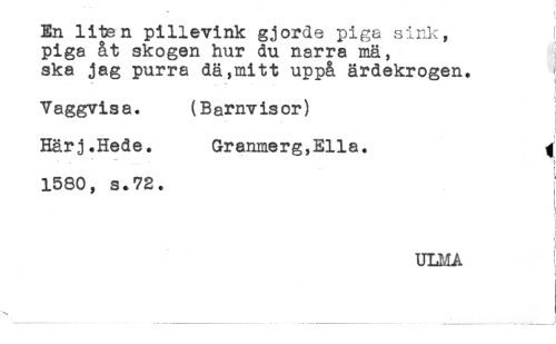//// En liten pillevink gjorde piga sink, I //// piga &t skogen hur du narra mä, //// ska jag purra dä^mitt uppa ärdekrogen. //// . .... ) //// Vaggvisa. (Barnvisor) ! //// i //// Härj.Hede. Granmerg.Ella. ^ //// 1580, s.72. //// t //// r //// t //// ! //// < //// t //// t //// ] //// ULIvIA //// i //// r ////