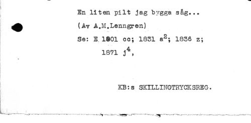 //// En liten pilt jag bygga sag... //// (Av A.M.Lenngren) //// - //// Se: E 1801 cc; 1851 a^; 1856 z; //// 1871 //// (t //// T ' //// - //// * //// I' ** //// KB:s SKILLINGTRYCKSREG. //// ---^ ---- ----*- --- ////