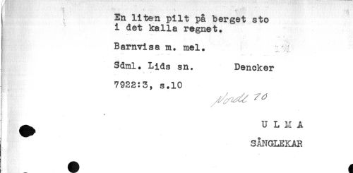 //// ; - //// En liten pilt på berget sto //// i det kalla regnet. //// '*** * * - //// Barnvisa m. mel. ^ //// Sdml. Lids sn. Dencker //// ä ... - ' ' //// 7922:3, s.lO //// ^ U L M A //// SÅNGLEKAR ////