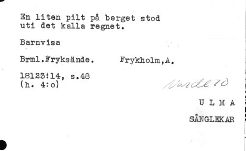 //// En liten pilt på berget stod //// uti det kalla regnet. //// i //// i //// Barnvisa j //// *<* " L //// Brml. Fryks ä nd e. Fr ykh olm, A. //// 18123:14, s.48 //// (h. 4:o) //// U L M A ! //// SÅNGLEKAR ! //// t- ////
