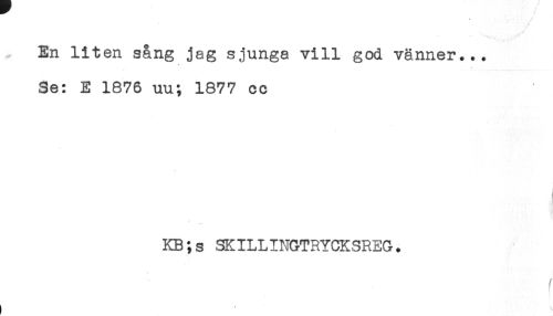 //// En liten sång jag sjunga vill god vänner... //// * //// Se: E 1876 uu; 1877 cc //// § //// KB;s SKILLINGTRYCKSREG. //// f ////