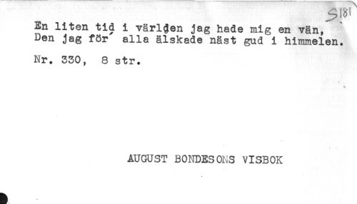 //// En liten tid i värlgen jag hade mig en vän, //// Den jag för alla älskade näst gud i himmelen. //// Nr. 330, 8 str. //// * //// AUGUST BONDESONS VISBOK ////