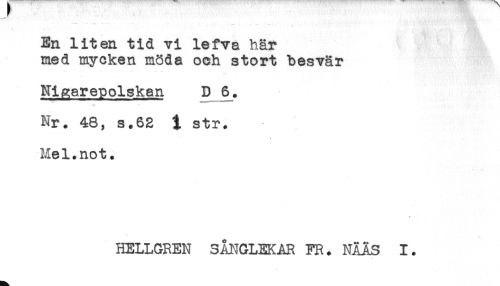 //// En liten tid vi lefva här //// med mycken möda och stort besvär //// Nigarepolskan D 6. //// - //// Nr. 46, s.62 t str. //// Mel.not. //// KELLGREN SÅNGLEKAR FR. NÅAS 1. ////