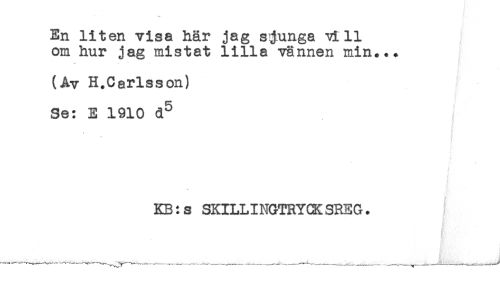 //// En liten visa här jag sjunga vi 11 //// om hur jag mistat lilla vännen min... //// * - * //// (Av H.Carlsson) //// Se: E 1910 d^ I //// KB:s SKILLINGTRYCK SREG. ////