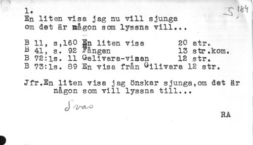 //// En liten visa jag nu vill sjunga ^ //// om det är mågon som lyssna vill... //// B 11, s,160 En liten visa 20 atr. //// B 41, s. 92 Fången 13 str.kom. //// B 72:is. 11 Gelivara-viaan 12 str. //// B 73:ls. 89 En visa från ^ilivara 12 str. //// ! //// * //// Jfr.En liten visa jag önskar sjunga,om det är //// någon som vill lyssna till... //// ! //// r i ////