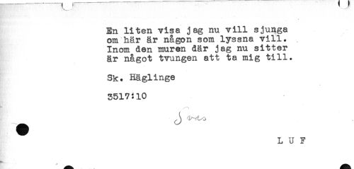 //// ^__ //// En liten visa jag nu vill sjunga //// om här är någon som lyssna vill. //// Inom den muren där jag nu sitter //// är något tvungen att ta mig till. //// Sk. Häglinge //// 3517:10 //// A ////