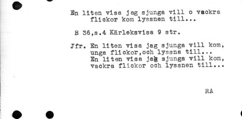 //// En liten visa jag sjunga vill o vackra //// flickor kom lyssnen till... //// B 36,s.4 Kärleksvisa 9 str. //// Jfr. En liten visa jag sjunga vill kom, //// unga flickor,och lyssna till... //// En liten visa ja& sjunga vill kom, //// vackra flickor och lyssnen till... //// ! //// ! //// * * ////