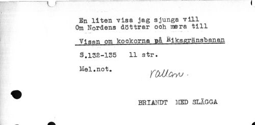 //// En liten visa jag sjunga vill //// Om Nordens döttrar och mera till //// * -i-** **** -* - <*' //// Visan om kockorna på Rikssränsbanan //// s.132-135 11 str. //// Msl.not. ^^ ////